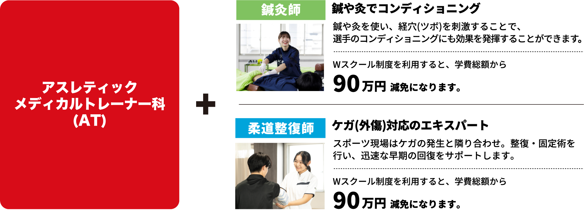 アスレティックトレーナー(AT)資格と医療資格を保有することで、スポーツ選手に、ケガの治療や運動療法、健康管理やコンディショニングを通じて、選手がよりよいコンディションで競技を続けられるよう、更にはパフォーマンスアップまでをサポートすることができます。メディカル的な側面とフィジカル的な側面の両方からアスリートをサポートする高度な専門性が求められる職業であり、近年、スポーツ業界での需要が急増しています。